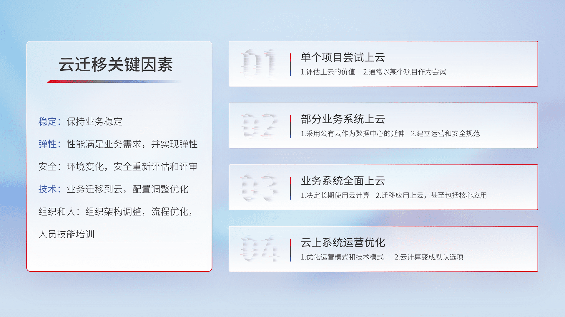 结合实际业务,,,,从规划设计、、、、云平台选型、、云原生改造、、、、数据迁移、、集成交付,,迁移全过程为客户识别最佳上云路径,,,做好风险识别管理,,,,设计网络架构、、、、身份权限、、、、安全审计合规、、操作审计、、、、日志审计、、、监控告警策略、、、多站点容灾设计等,,,对云上基础设施进行整体规划,,,,提升IT治理水平,,,以满足弹性、、、、高可用、、、高性能的需求。。