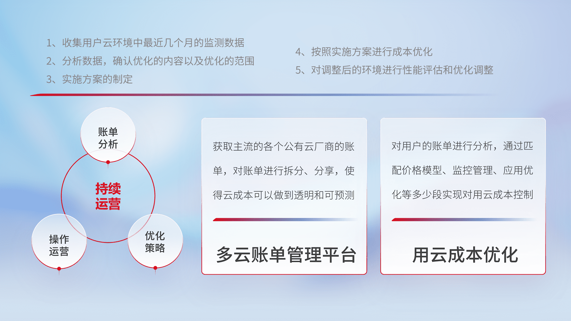 通过多云纳管,,以统一的资源数据模型把客户的云资源进行抽象和封装,,,,进而实现对多云资源的统一操作,,保障云资源管理的可靠性、、、稳定性与可用性。。。量身定制化运维内容,,,,配置、、开发运维、、、补丁管理、、、备份、、监控、、、、认证和访问管理、、审计和日常巡检等,,保障在用云过程中的可靠度,,稳定度以及高可用率。。。。
